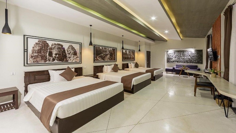 Rooms are beautiful and very spacious for the three of us,massive bath and separate shower . Swimming pool is lovely and peaceful, shaded, to relax, only eat breakfast in hotel,good. Location is very central 5 minute walk to markets and pub street, the hotel has its own tuktuk drivers who will take you on the tours for the day, fantastic service definitely recommend. Would stay there again