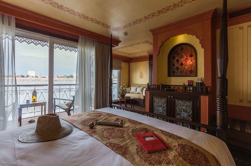 There are 4 signature cabin on this Mekong cruise ship, two on the main deck (36sqm in toal, 5sqm balcony) and two in the front of the upper deck (32sqm in total, 3sqm balcony). Each one features king size beds. All cabins have a dignified appearance with luxurious decorations.